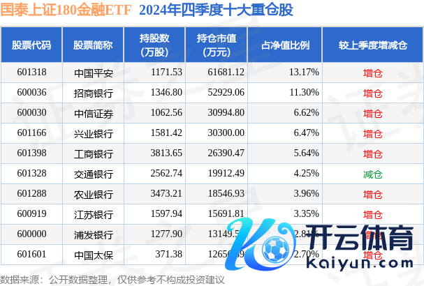 国泰上证180金融ETF为指数型-股票基金,证明最新一期基金季报知道,该基金钞票建树:股票占净值比99.91%,无债券类钞票,现款占净值比0.16%。基金十大重仓股如下: